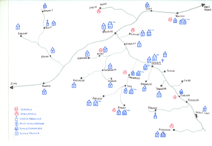 Sta calando la notte alla missione di Emdibir e le iene iniziano con il loro ghigno minaccioso a sovrastare la voce di Paolo, un giovane italiano che pochi anni fa ha deciso di lasciare la casa natale per dedicarsi alle attività della diocesi della Chiesa cattolica in questo angolo di Etiopia, al sud di Addis Abeba. Davanti ad una mappa mi perdo dietro le sue indicazioni delle tante scuole, ambulatori e strutture che la Chiesa gestisce. “Qui è necessario considerare che le distanze vengono percorse a piedi o al massimo col mulo. È per questo che siamo costretti a realizzare tante scuole ed ambulatori, per riuscire ad assistere concretamente gli abitanti di ogni villaggio” – mi spiega prendendo in braccio una dolcissima bambina dalla pelle ambrata, la seconda delle sue figlie nate dal matrimonio con una bella ragazza proveniente da una regione del nord del Paese.