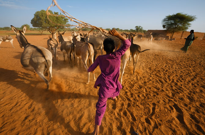 Beating back thirsty donkeys, a Tuareg boy keeps order at a desert well.