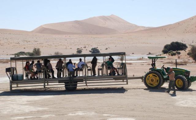 Questo vagoncino trainato da un trattore è veramente orribile! Sono stata a Sussusvlei in ottobre 2010 e siamo arrivati alle dune con delle auto del Parco, dopo aver lasciato il nostro pullman oltre la Duna 45. Non mi era sembrata una cattiva soluzione. Viste le temperature, credo che l’alba sia l’unico momento adatto per gustare a pieno questo deserto e per ammirare il tramonto sulle dune c’è una infinità di spazio prima della duna 45.