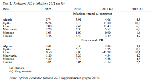 Il recupero dei paesi nordafricani che hanno vissuto la rivoluzione dipenderà, invece, dal processo di transizione di breve termine. . necessario migliorare la sicurezza dei territori, ricostruendo cos. la fiducia degli investitori esteri. Partendo da queste premesse, la crescita economica prevista per il 2012 è dello 0,8% in Egitto, 2,5% in Tunisia, e 20% in Libia.