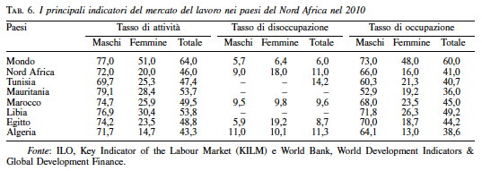 Mediamente, considerando l’ultimo decennio, in Nord Africa più di due donne su tre non entra nel mercato del lavoro e, tra coloro che vi riescono, più di tre su venti sono disoccupate. Pertanto, l’area pur presentando tassi di partecipazione degli uomini allineati a quelli medi dei paesi sviluppati, manifesta un basso tasso di partecipazione al lavoro prevalentemente a causa della limitata partecipazione femminile.